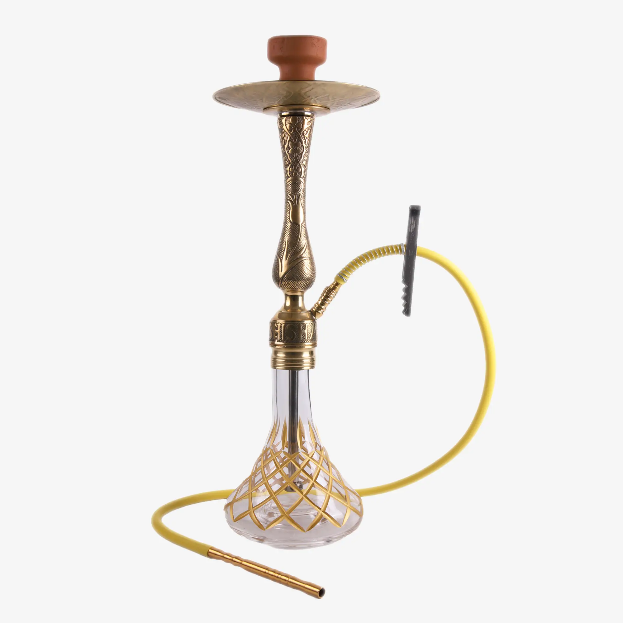 Bu takımın en dikkat çekici özelliklerinden biri, pirinç malzemeden üretilmiş olmasıdır. Pirinç, nargile gövdesinin dayanıklılığını artırırken, aynı zamanda paslanmaya karşı üstün koruma sağlar. Şişe kısmı, zarif bir kesme desenle süslenmiş olup, hem klasik hem de modern bir görünüm sunar. İç boru ve difüzör tasarımı, dumanın daha yumuşak ve keyifli bir şekilde çekilmesini sağlar.